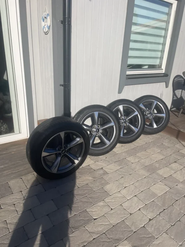 Däck med fälgar, kompletta sommar hjul.Aluminiumfälgar 8, X 18\\”5/114,3navhål 70,5 ET 40 . Däck 235/50 R 18 . bra mönster djup. Fälgarna är frånFord Mustang2015 å framåt . Passar även till Mustang 2005-framåt, passar säkert med andramodeller och bilmärken , Pris 6400kr eller bud