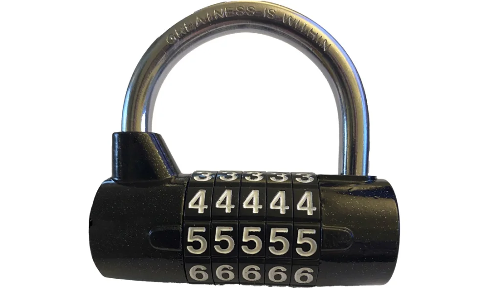 Kraftigt hänglås med kodinställning på 5 siffror.